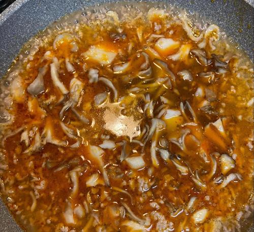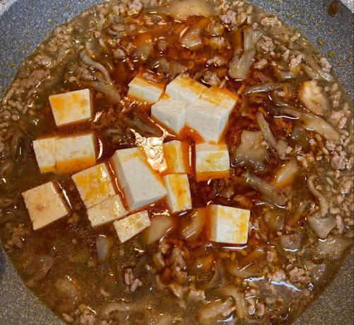 調味料Bを入れて沸騰させる。木綿豆腐を一口サイズにカットして入れ、沸騰させる。沸騰したら火を止めて水溶き片栗粉でとろみをつけ、さらに少し煮込む。
