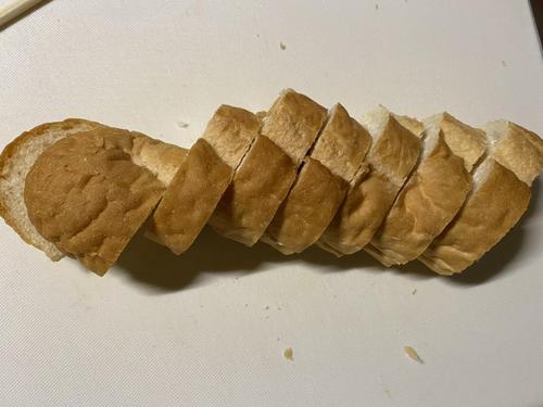フランスパンは8枚にスライスし、オーブントースターでこんがりと焼く。