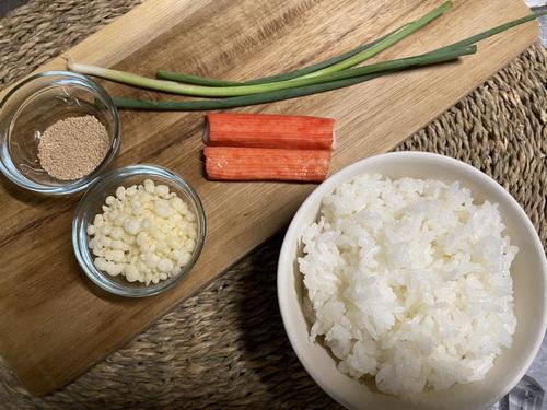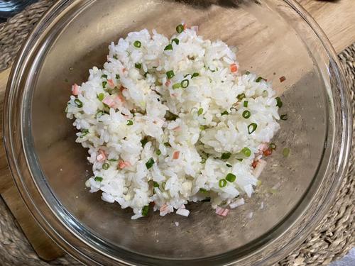 ボウルに全ての材料を入れ、全体を混ぜる。ごはんを4等分し、小ぶりなおにぎりを4つ作る。3回ほど軽く握って形を整え、お皿に並べて完成。
