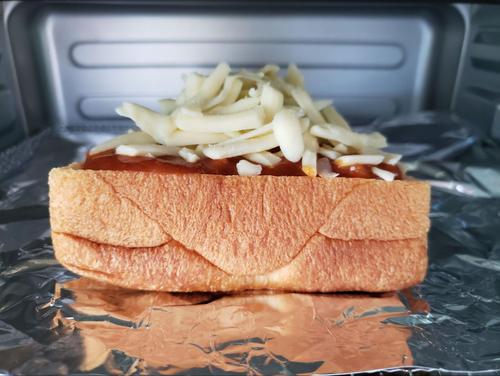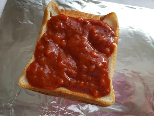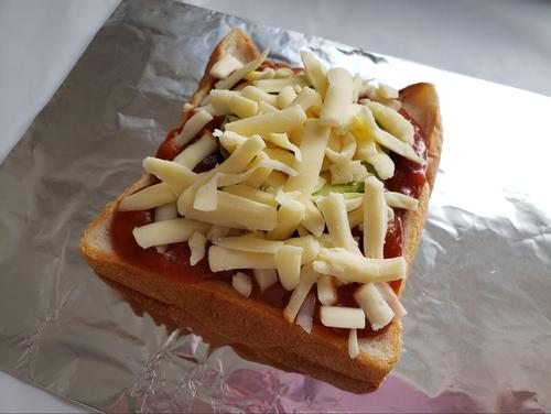 最初にアルミホイルに食パンをのせておけば、焼く時に具材がこぼれてもトースターが汚れない。