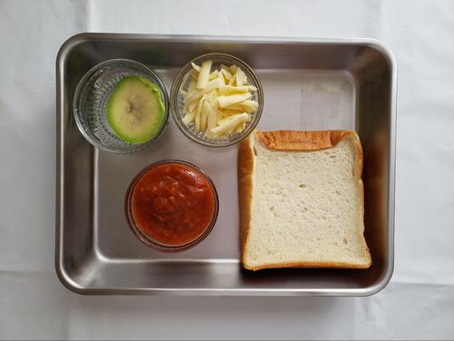 アボカドの皮をむき、種をとって半分に切る。そのうちの1/2個を、好みで食べやすい大きさにスライスしておこう。アルミホイルの上に食パンをのせてミートソースを塗る。食べ応えをだしたいので、たっぷりのミートソースと厚切りのパンを使用する。