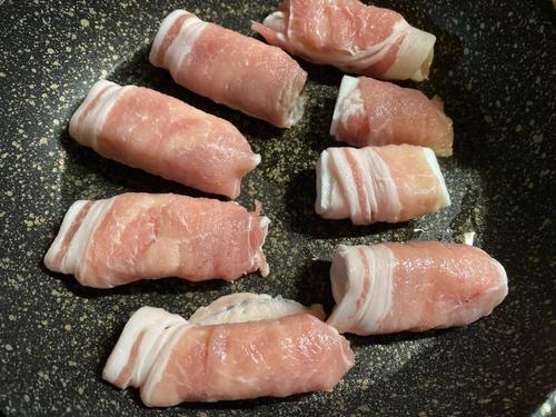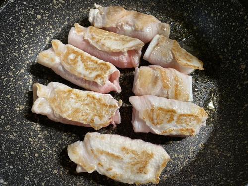 はじめに巻き終わりを下にして焼き、豚肉がはがれないようにする。