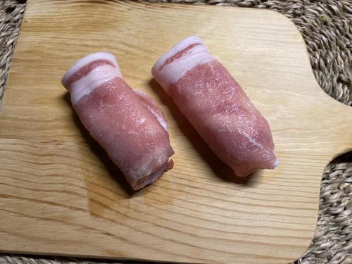 はんぺんを豚肉で巻く。きつめに巻き、巻き終わりを下にして置いておく。