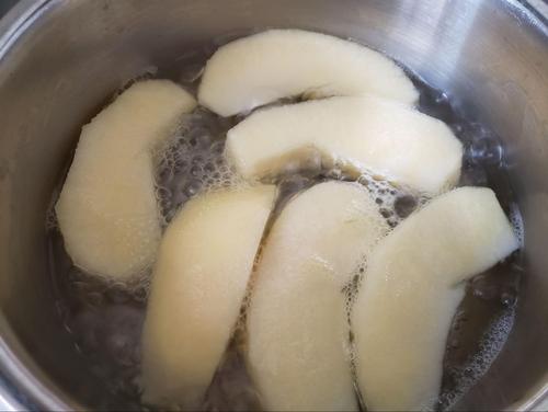 水とりんごを鍋に入れて、弱火で20~30分水気がなくなるまで煮る。だんだんりんごが薄い飴色になり、やわらかくなったらできあがり。