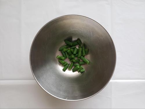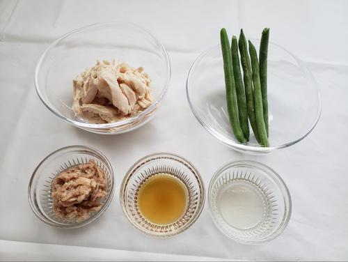 さやいんげんはよく洗って、筋をとり2分ほど茹でる。冷めたら、一口大に切ってボウルに入れる。