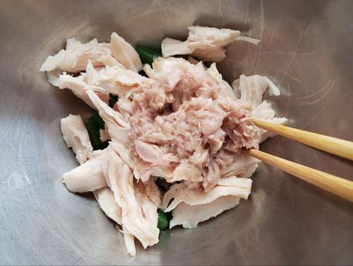 STEP1.のボウルにサラダチキン、ツナ、ポン酢、酢を入れてよく和える。全体にしっかり混ぜてできあがり。