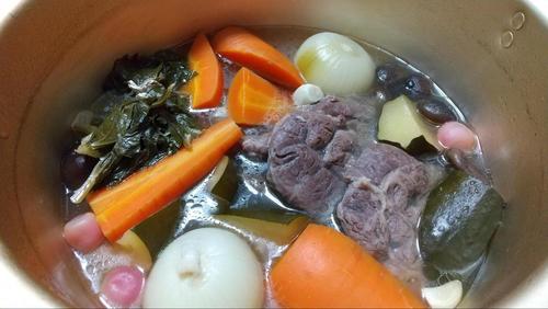 中火で煮込み、途中、アクが出てきたら取り除く。水の量が半分程度になるまで、ぐつぐつ2時間?3時間は煮込む。途中で火加減が強すぎて水がなくなってきたら足す。
