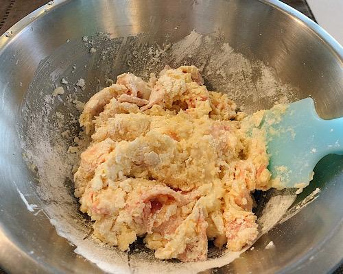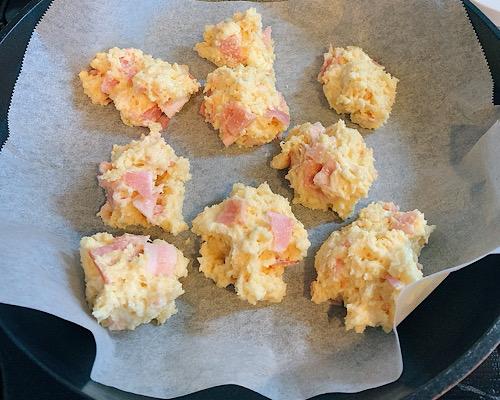 ベーコンをキッチンバサミで短冊切りにして、キリチーズは手で割りながら加えていく。ホットケーキミックスも加えて、ゴムベラを使って混ぜ合わせる。これで、生地の完成となる。