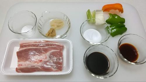 野菜(ピーマン、パプリカ、セロリ)は1cm程度の角切りにする。豚肉は漬けこんでいた袋から出し、軽く叩いてから4つに切る。