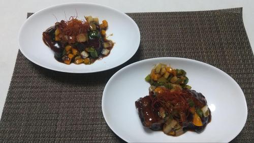 油をしいたフライパンで、野菜をサッと炒めて取り出しておく。続いて、フライパンに調味料を入れてそこに揚げた豚肉と水100mlを加えて火にかける。沸騰してきたら水溶き片栗粉(大さじ1、分量外)と炒めた野菜を入れて、とろみが出たら完成。