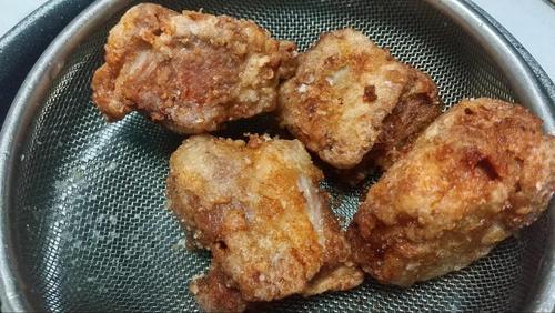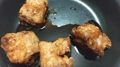 片栗粉を豚肉にまぶす。好みで、固めにしっかりガリっとさせたい時は厚めにまぶし、軽めにカリっとさせたい時は薄めにまぶす。揚げ油を170℃に熱して豚肉を入れる。片面10分程度ずつ、合計20分位かけてじっくり揚げる。途中菜箸で油を混ぜながら揚げると、油の温度が均一になりむらなく揚がる。