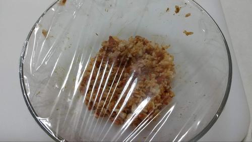 材料が混ざったボウルにラップを掛けて、700Wの電子レンジで5分加熱する。