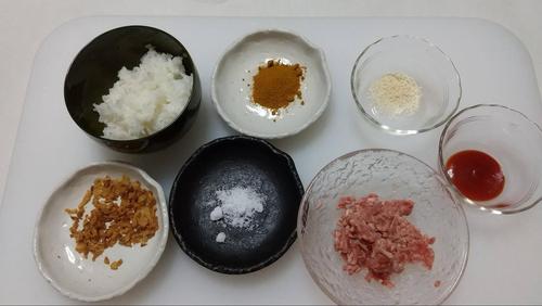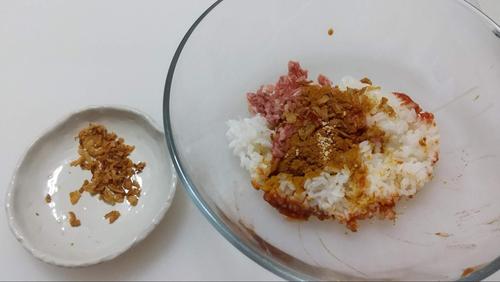 フライドオニオンは半分残して、それ以外の全ての材料をボウルに入れる。満遍なくカレー粉が混ざるように、しっかり混ぜる。