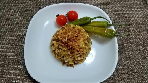 加熱したものをお皿に盛りつけて、残ったフライドオニオンを飾ったら完成。好みの野菜を一緒に盛ると、彩りもキレイだろう。