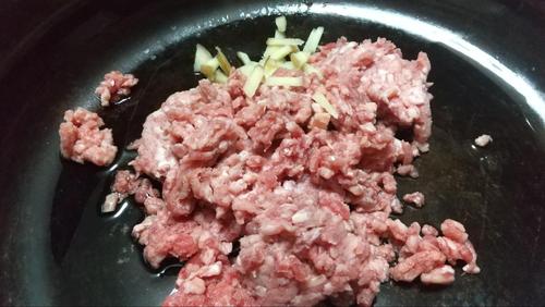 フライパンにごま油を入れて、生姜、ひき肉を色が変わる程度に炒める。
