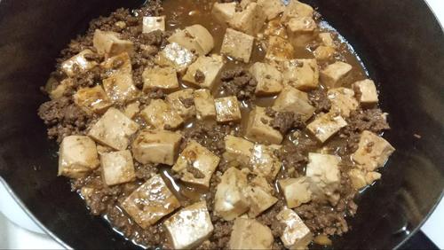 豆腐と調味料、80mlの水を加える。そして、蓋をして中火で7分煮込む。