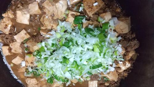 豆腐を煮込んだら、最後に長ネギを入れてひと煮立ちさせる。そして、煮立ったところに水溶き片栗粉を入れて軽く混ぜて完成。