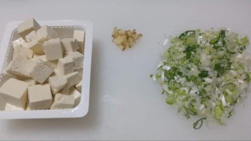 豆腐はサイの目にして、長ネギと生姜は粗みじん切りにする。豆腐は大きめが好みの場合は大きく、小さめが好みなら小さくすればよい。木綿豆腐を使用している場合は、さほどに崩れることはないが、絹ごし豆腐の場合は煮込んでいる間にくずれることを考慮して切る。
