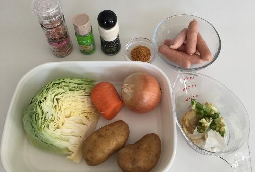 にんじんは乱切り、玉ねぎはくし切り、キャベツは4cm角のざく切り、じゃがいもは一口大に切り、水にさらしておく。ウインナーは、斜めに切り込みを入れる。
