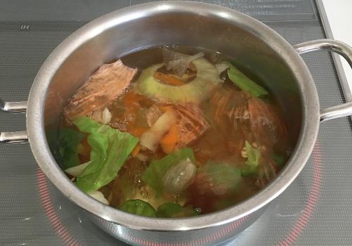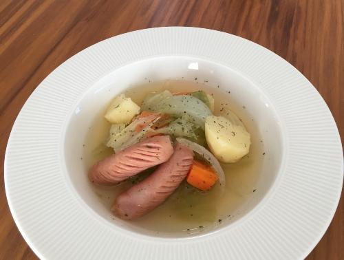 煮詰まって水分量が減っているので、出汁と水を足して800mlにして鍋に入れる。野菜とウインナーを入れ、沸騰したらアクを取る。顆粒コンソメを加えて野菜がやわらかくなるまで、15分ほど蓋をして弱火で煮る。