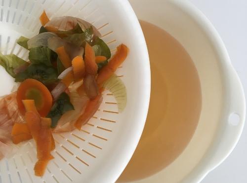 火からおろし、ザルで濾して野菜の皮と出汁に分ける。