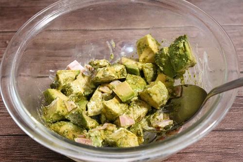 ボウルにアボカド、ハーフベーコン、カマンベールチーズ、調味料を加え全体をよく混ぜ合わせる。