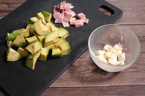 アボカドは皮をむいて種を除き、2~3cm角に切る。ハーフベーコン、カマンベールチーズ、は1cm角に切る。
