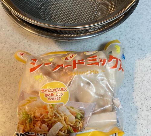 シーフードミックスは塩分濃度3%の塩水に10分浸して解凍する。(300gに対して9gの塩につける)
