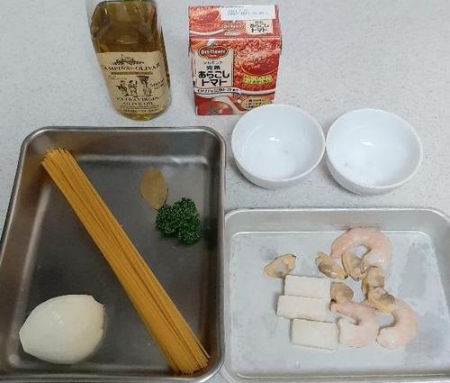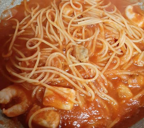 スパゲティが茹で上がる約3分前にシーフードミックスをフライパンに入れ、中火で焼いて焼き色を付け、トマトソースを入れる。スパゲッティが茹で上がったら、フライパンに入れて中火で1分程度炊いたら、お皿に盛り付ける。