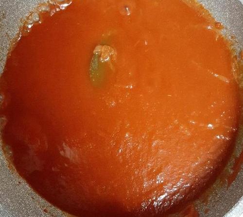 玉ねぎを繊維に沿って薄切りにする。フライパンに玉ねぎとオリーブオイルを入れ、弱火にかける。玉ねぎがきつね色になるまで、10分ほどじっくり炒める。残りのトマトソースの材料を入れ、アクを取りながら弱火で20分炊く。