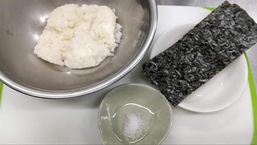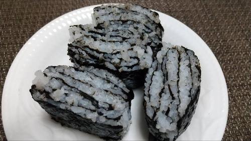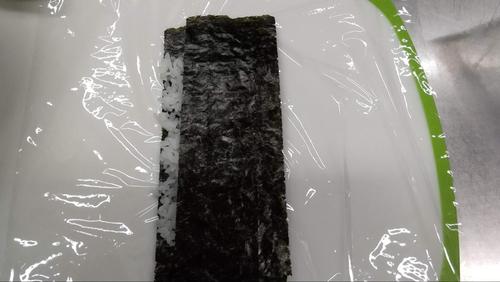 まな板の上に海苔を置き、その上に薄くごはんを敷く。そしてその上に海苔を置く作業を、ごはんがなくなるまで続ける。ごはんがなくなったら、最後に海苔をおく。