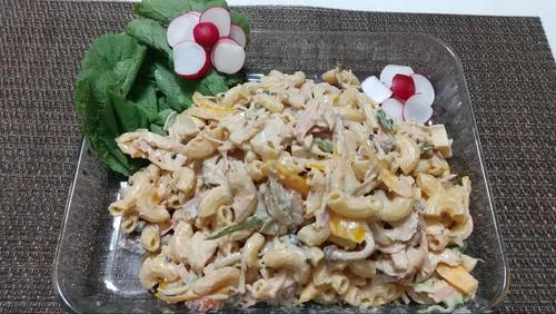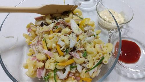 茹でたマカロニとキノコと調味料を全部よく和える。そこにベーコンとチクワを入れてよく混ぜる。最後にピーマンとパプリカ、ミョウガを合わせて混ぜて完成。