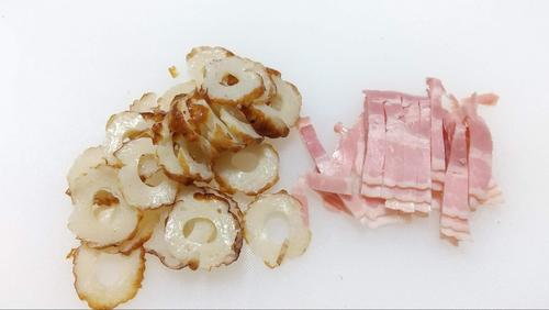 野菜(ピーマン、パプリカ、ミョウガ)は生のまま入れる。種と端を落とし、ごそごそしないように小さめに細かく切る。キノコ(エリンギ、しめじ、えのき)はマカロニと同じか少し小さいくらいに切る。ベーコンとチクワは好きな大きさに切る。