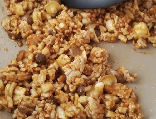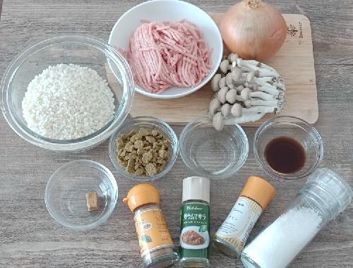フライパンに豚ひき肉、おろしにんにくを入れて中火にかけ、脂が出てきたらしめじを加えて炒める。そこに酒、ガラムマサラ、ナツメグ、カレールーの1/3を加え、さっと炒めて火を止める。ごはんの炊きあがりと時間差ができる場合は、蓋をして乾燥を防ぐ。