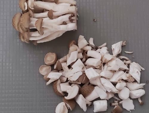 玉ねぎは皮を剥いて上下を落とし、粗めのみじん切りにする。しめじは石づきを落とし、1cm程のざく切りにする。カレールーは細かく刻んでおく。