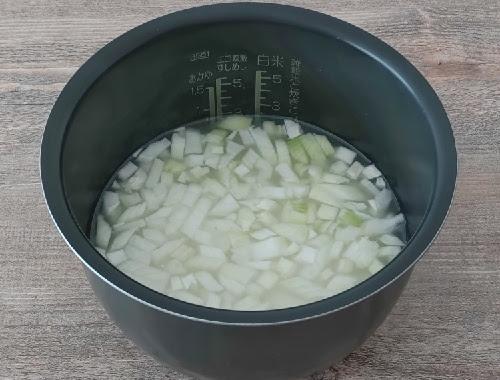 炊飯釜に、洗った米と2合分の水を入れる。そこに、刻んだ玉ねぎ、コンソメ、刻んだカレールーの1/3を加えて通常通り炊飯する。