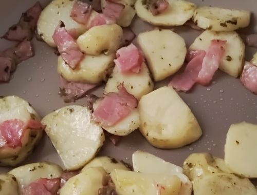 フライパンに、ジェノベーゼソースのオイル(上澄み)を大さじ1程度入れる。中火にかけ、フライパンが温まってきたらベーコンとじゃがいもを加える。じゃがいもは重ならないように並べ、軽く焼き目をつける。焼き目がついてきたら、ジェノベーゼソースの残りを加えて全体に絡める。