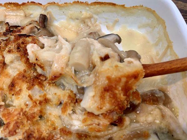 すでに全部の材料に火が通っているため、チーズが溶けてパン粉にキレイな焦げ目が付けばできあがり。生野菜のサラダを添えていただこう。