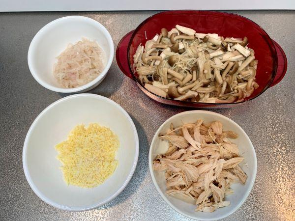 エシャロット(または玉ねぎ)は、薄切りにして植物油少々(分量外)をふりかけ、600W の電子レンジに40秒かける。サラダチキンは手で粗く裂く。