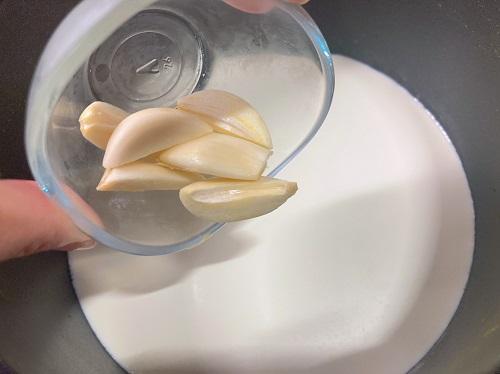 鍋に生クリームをいれる。にんにくは縦に4つほどにカットし、芽は取り除く。鍋ににんにくをいれて弱火で煮る。沸騰しないように、木べらでかき混ぜながらにんにくが柔らかくなるまで煮る。にんにくに火が通ったら火を止め、フォークの背を使って鍋の中でつぶしていく。
