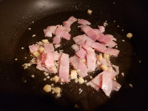 にんにくの香りが立ってきたら、白ワインとベーコンを入れる。ベーコンの香りも立たせ、オイルにしっかり香りと旨みをつけていこう。