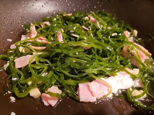 にんにくとベーコンの香りが出てきたら、切り昆布を入れて強火にしてさっと炒めて仕上げる。きざみにんにく、ベーコン、切り昆布の塩分で味が付いているが、味をみて足りない場合は塩(分量外)を加えて味を整える。