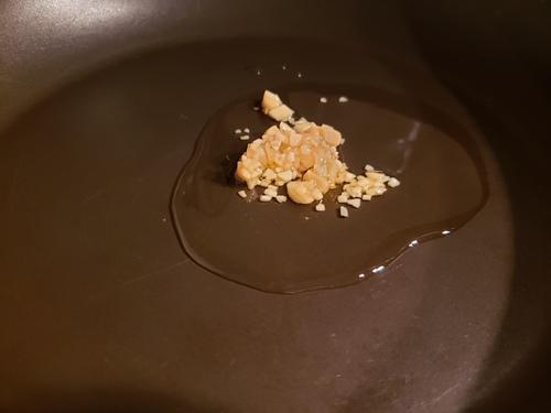 あらかじめ熱せられたオイルににんにくを入れると焦げや香りが移らない。フライパンにオリーブオイル、にんにくを入れてから弱火にかける。
