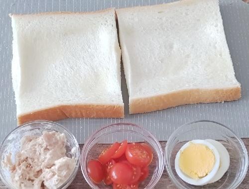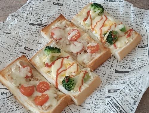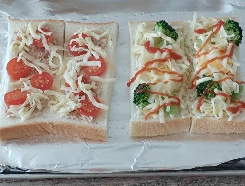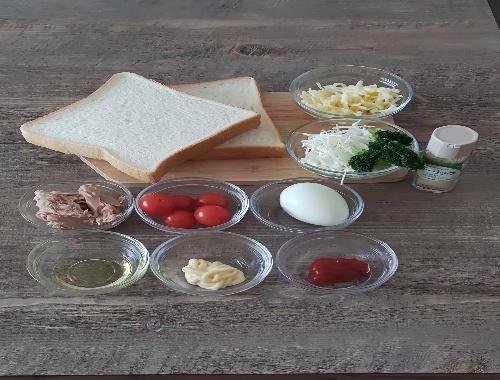 具材を準備する。ミニトマト、茹で卵はそれぞれスライスに、茹でブロッコリーは食べやすい大きさにカットする。ツナは油をきり、マヨネーズと和えておく。パンの白い部分に、オリーブオイルを薄く塗り、好みで具材を乗せていく。具材の上からピザ用チーズ、ケチャップ、追加のマヨネーズ、ガーリックパウダーなどをトッピングする。