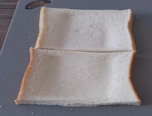 食パンは上下1組の耳を落とし、ラップかキッチンペーパーを被せる。麺棒または、ペットボトルなどで食パンの白い部分を押し潰す。