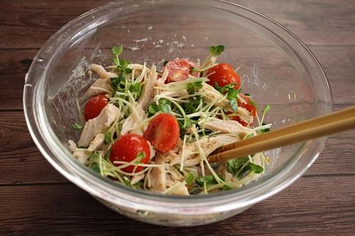 サラダチキンは、手でほぐす。かいわれ大根は、根元を切り落とし半分に切る。プチトマトは、ヘタを取り、半分に切る。