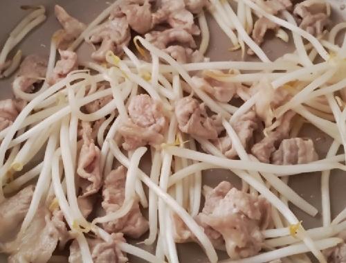 フライパンにごま油を熱し、豚小間切れ肉を加える。酒、もやしを加えて炒めて、塩、こしょうで味を整える。