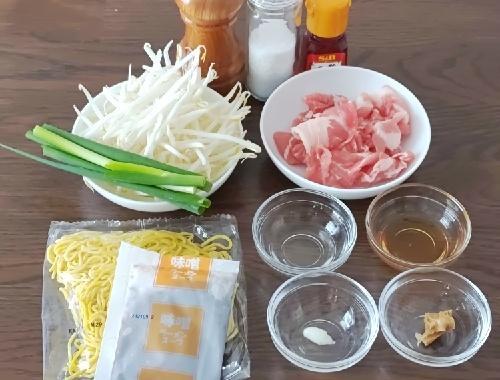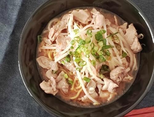 中華麺を指定の時間より30~40秒程短めに茹でる。湯切り後、器に麺を盛りスープを注ぐ。炒めたもやしと豚肉を中央にこんもりと盛り、小葱とラー油を垂らして完成だ。