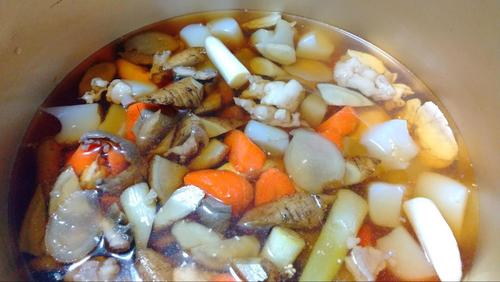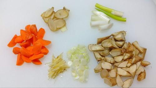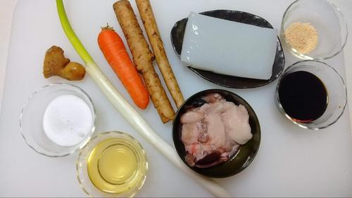 人参、牛蒡は皮をむき、小さめのひと口大に切る。長ネギと生姜は煮込み用と飾り用に分けて切る。煮込み用の生姜は薄切り、飾り用は薄切りにしたものを千切りにする。煮込み用の長ネギはぶつ切り、飾り用は細かい小口切りにする。それぞれ量の配分は好みで決める。
