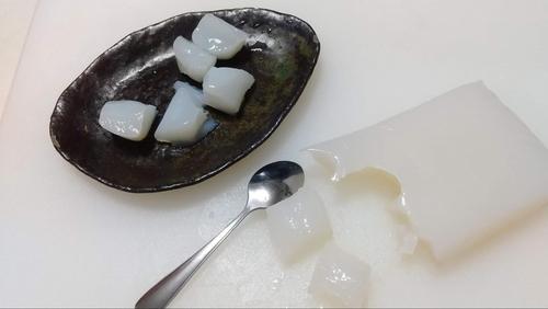 お湯を沸かす間にこんにゃくをちぎっておく。スプーンを使うとやりやすい。包丁で切るより味が染みこみやすいので、ちぎるほうがおすすめだ。ちぎり終わったら、ザルに入れて熱湯をかけ、アク抜きをする。
